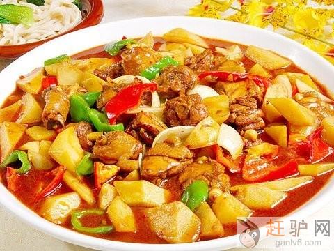 新疆大盘鸡又名为沙湾大盘鸡,是新疆名菜,起源于20世纪80年代后期,主要用料为鸡块和土豆块,配皮带面烹饪而成赶_驴_网。色彩鲜艳、爽滑麻辣的鸡肉和软糯甜润的土豆,辣中有香、粗中带细,是餐桌上的佳品欢迎www.ganlv5.com。